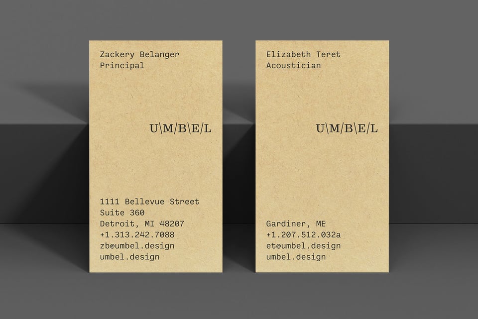 We were asked to do branding for Umbel, a new Detroit-based acoustics studio that “approaches acoustics through the lens of shape.” The mark is created entirely of typographic elements, and can be typed at a keyboard; slashes and backslashes represent sound waves. Type palette based on our own Reckham and Ballinger Mono typefaces. More here. →