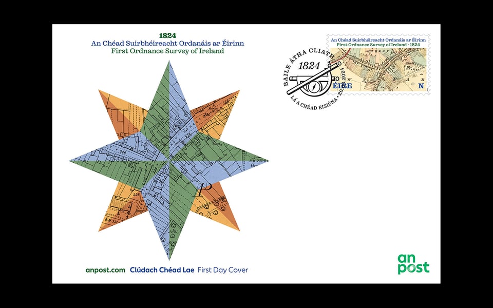 Nice to see my stamp for An Post out in the world, commemorating 200 years since the first Ordnance Survey of Ireland. Many thanks to the lovely people at Tailte Éireann who tirelessly dug through their map archives for me and made high-quality custom scans. The cancellation stamp was fun to draw, too: that’s an antique brass graphometer. This was the first outing for our own Reckham, and still one of our favorites.