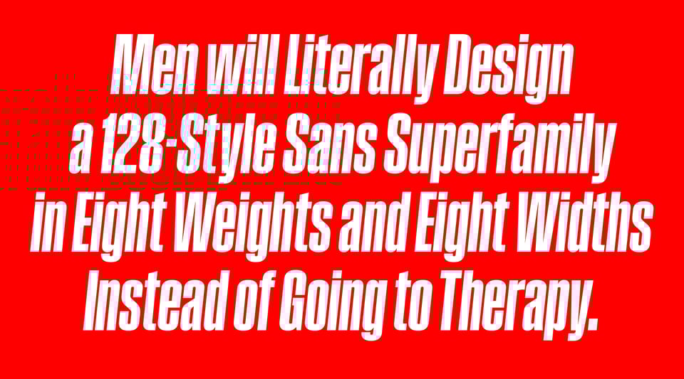 I launched Field Gothic back in 2022. It went from absurdly narrow to insufferably wide, from barely visible to vantablack, with a few relatively normal styles along the way, and it all added up to 64 styles, which was apparently not enough to fill the aching void inside me. So this year, instead of taking a good, hard look at my choices in life, I’ve just doubled down and, with the help of the estimable Sebastian Carewe, added matching italics. And now it’s 128 styles, and I’m sure I’ll be happy at last. Don’t you agree? →